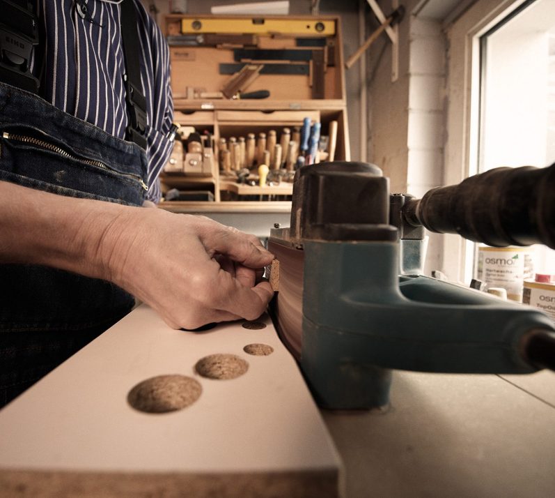 Auch die Materialien stammen überwiegend aus Deutschland: Holz, Oberflächen-Wachsöl, Schrauben und Pinholes werden sorgfältig ausgewählt.